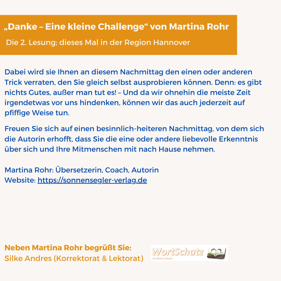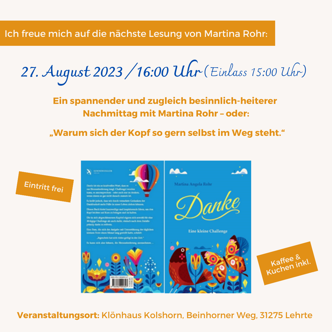 ich habe am Freitag die Lesung von Martina besucht und war ganz fasziniert. Ich bin ein sehr weltlich orientierter Mensch, der Esoterik grundsätzlich sehr skeptisch gegenüber steht und ich war mir nicht sicher mit welchem Gefühl ich aus dieser Lesung gehen werde. Nun bin ich aber selber gerade in meiner ganz persönlichen absoluten Lebenskrise und habe an diesem Abend etwas mitgenommen und umgesetzt was sofort einen immensen Effekt ausgelöst hat. Damit hätte ich nicht gerechnet. Ich würde Martina das gerne erzählen und mich bei ihr bedanken.